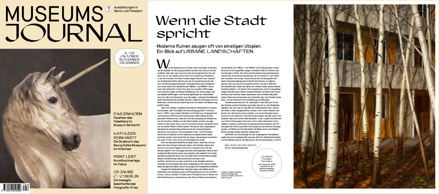 Angesichts tiefgreifender Veränderungen der Städte durch Digitalisierung, Globalisierung und Klimawandel lohnt sich ein Blick zurück. Und so erweitert Thoelke seine Perspektive durch Werke von Manfred Butzmann, Ursula Strozynski, Rainer Fetting und anderen, die das Berlin der 1980er- und 1990er-Jahre festgehalten haben. Butzmanns Druckgrafiken zeigen verfallene Villen in Pankow, den Hochbunker in Mitte, der heute eine Kunstsammlung beherbergt, meterhohe, fensterlose Hauswände, den Fernsehturm, der hinter den Fassaden hervorlugt. Ursula Strozynski hat die geisterhaft leeren Treppenaufgänge des S-Bahnhofs Ostkreuz so filigran gemalt, dass sie wie eine Fotografie wirken und der S-Bahnhof Jannowitzbrücke neben der Spree ist, mitsamt jeder seiner kleinen Fensterscheiben, mit festem Strich gezeichnet. Ihre Druckgrafiken prägen das Bild einer Stadt im steten Wandel. Die Werke der Künstlerinnen und Künstler dieser Generation sind inmitten des politischen Umbruchs entstanden und verbinden das, was Thoelke heute sieht, mit dem Moment ihrer Entstehung und Blütezeit.